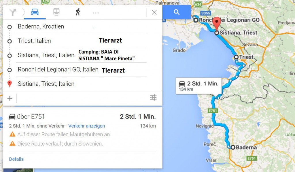 Zurück nach Triest und zum Tierarzt. Wir müssen eine Weile hier in der nähe von Triest bleiben und da bietet sich der wunderschöne Campingplatz in Sistiana an. Wir bleiben bis wir die Untersuchungsergebnisse haben. Da Pfingsten immer schwierige Platzsuche bedeutet buchen wir bis Pfingstmontag.